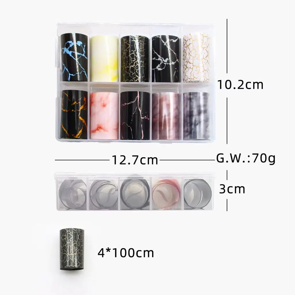 Bu set, tırnak üzerinde hızlı ve profesyonel görünümlü nail art tasarımları oluşturmak için hazırlanmıştır. Kutu içerisinde 10 adet transfer folyo bulunur ve her bir folyo 1 metre uzunluğundadır. Farklı desen seçenekleriyle tam kaplama, parça uygulama veya vurgu detayları kolayca yapılabilir.