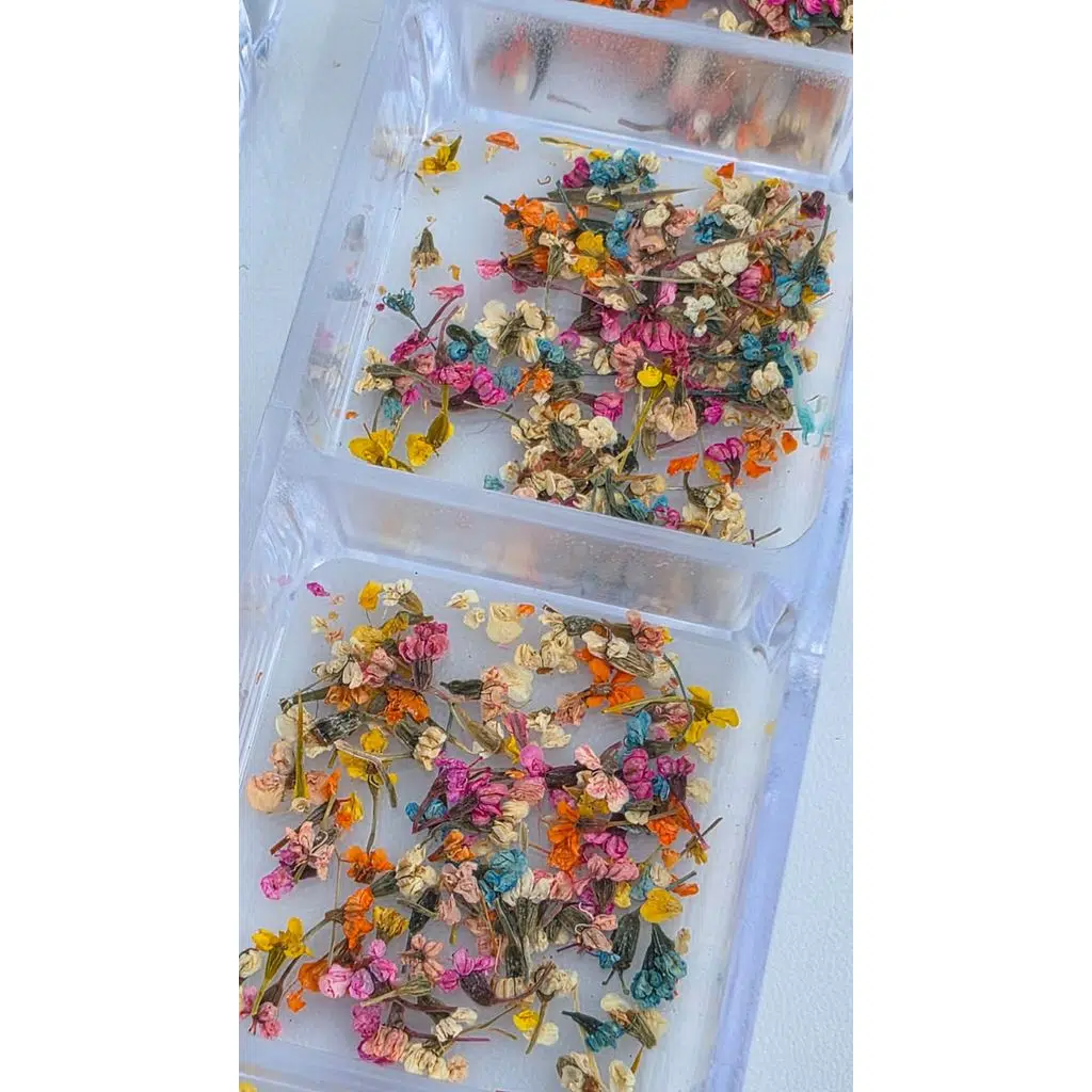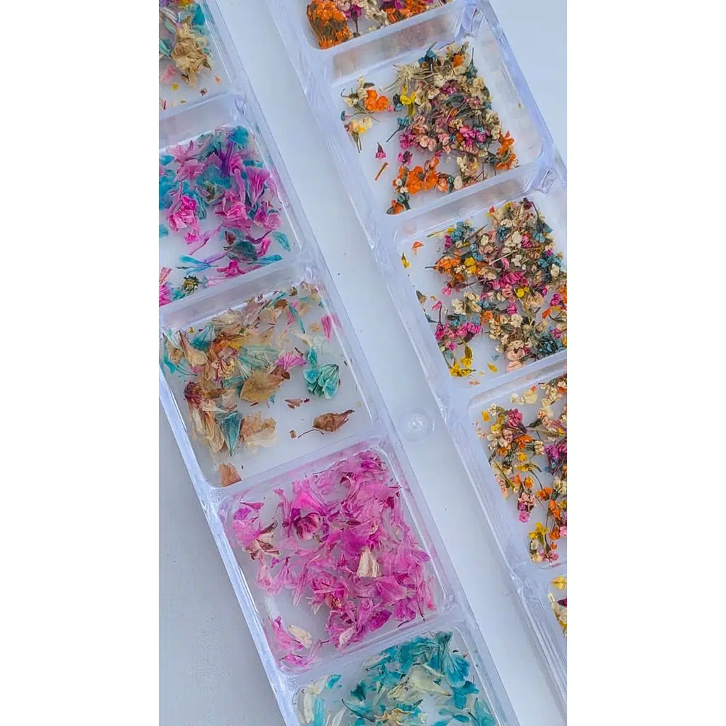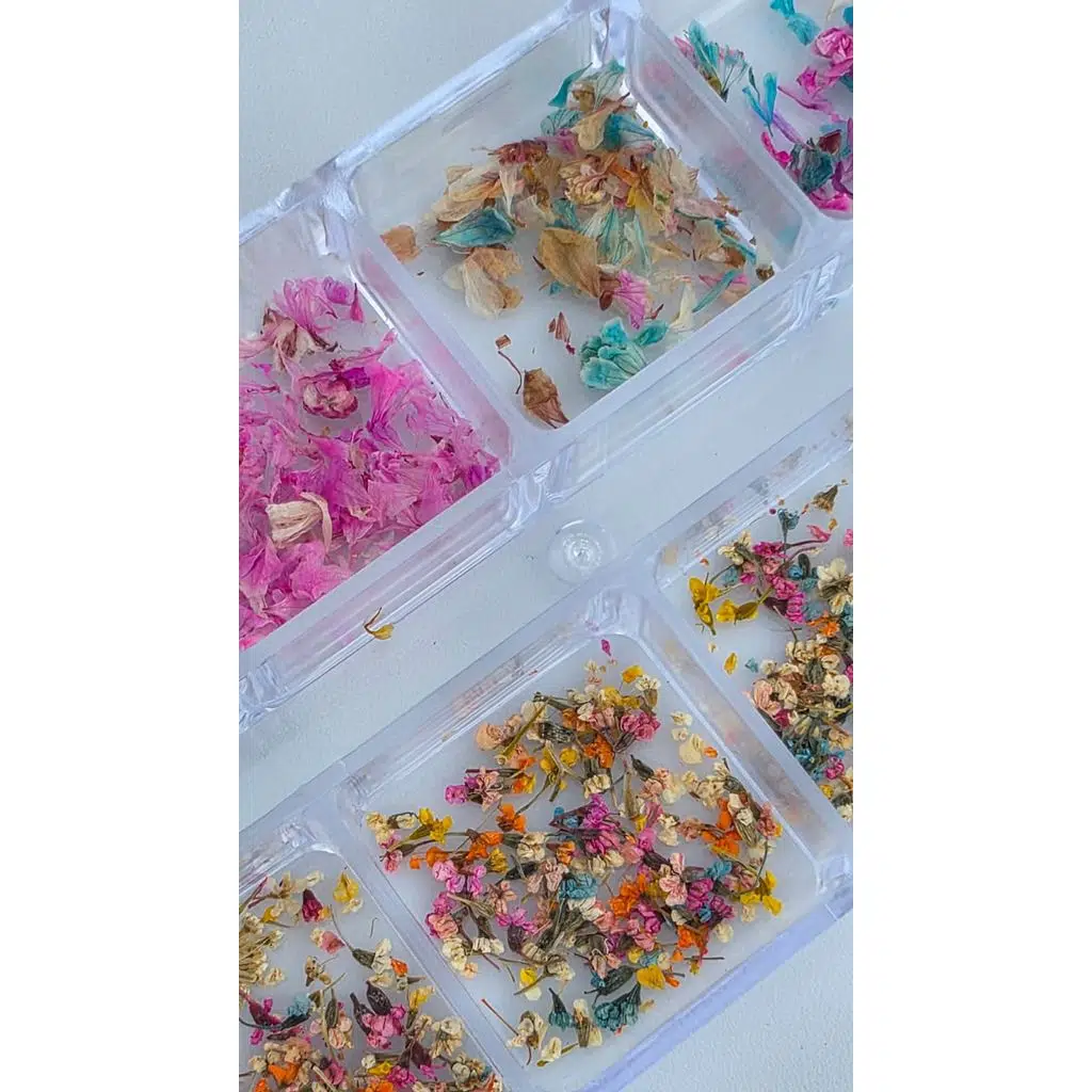Bu ürün grubu; tırnak sanatı uygulamaları için hazırlanmış kurutulmuş çiçek, yaprak ve bitki parçalarından oluşur. 12 bölmeli kutu tasarımı, renk ve parça türlerini düzenli şekilde ayırmayı sağlar. Doğal görünüm isteyen uygulamalar için uygundur ve özellikle nude, french ve şeffaf tasarımlarda estetik bir sonuç sunar.