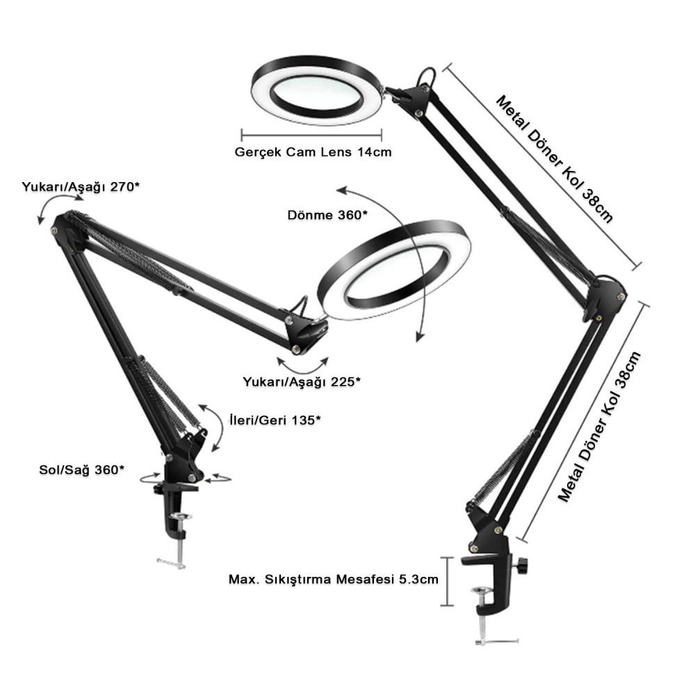 Akrobat Hareketli 8X Büyüteçli Led Masa Çalışma Lambası - Mengeneli (Beyaz)