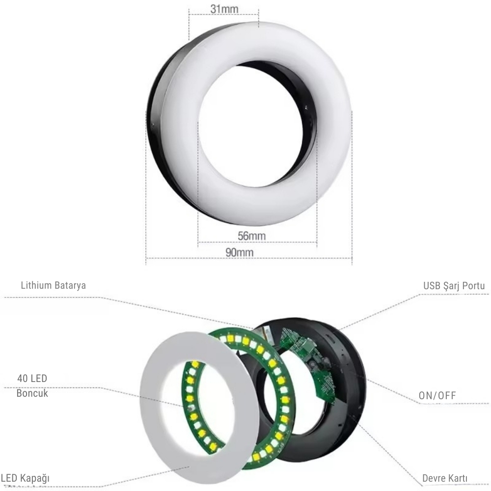 Kusursuz Aydınlatma: 40 adet yüksek kaliteli LED (20 beyaz + 20 sarı), yüzünüzdeki gölgeleri siler, cildinizi pürüzsüz gösterir ve gözlerinizde o meşhur "halo" ışıltısını yaratır.
