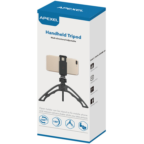 Model: Apexel APL-JJ04 Türü: Masaüstü Tripod ve El Tutacağı (Hand Grip) Başlık: 360 Derece Panoramik Top Başlık Kapalı Uzunluk: 15 cm Ağırlık: 128 gram (Hafif ve taşınabilir) Maksimum Yük: 2.5 kg Renk: Mat Siyah