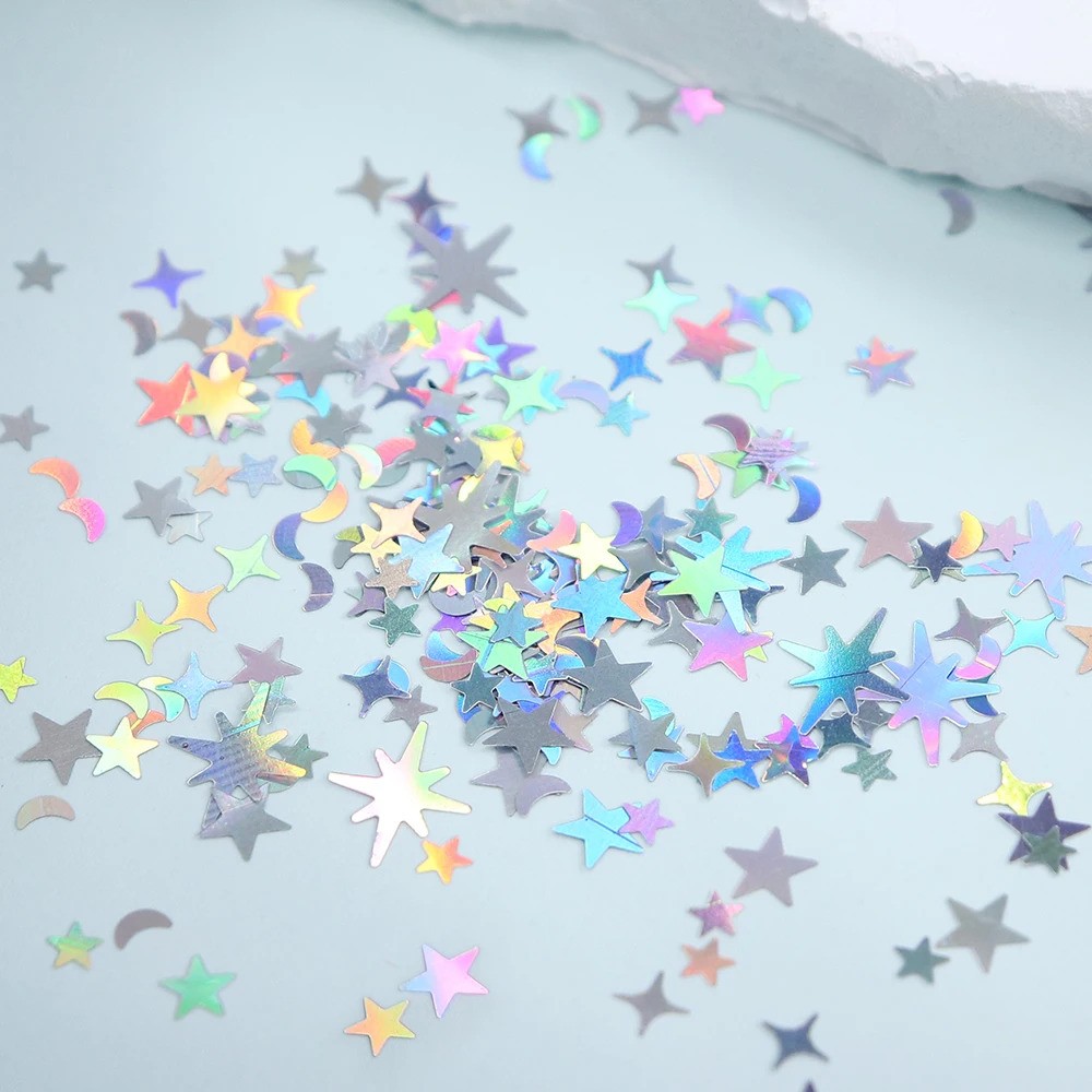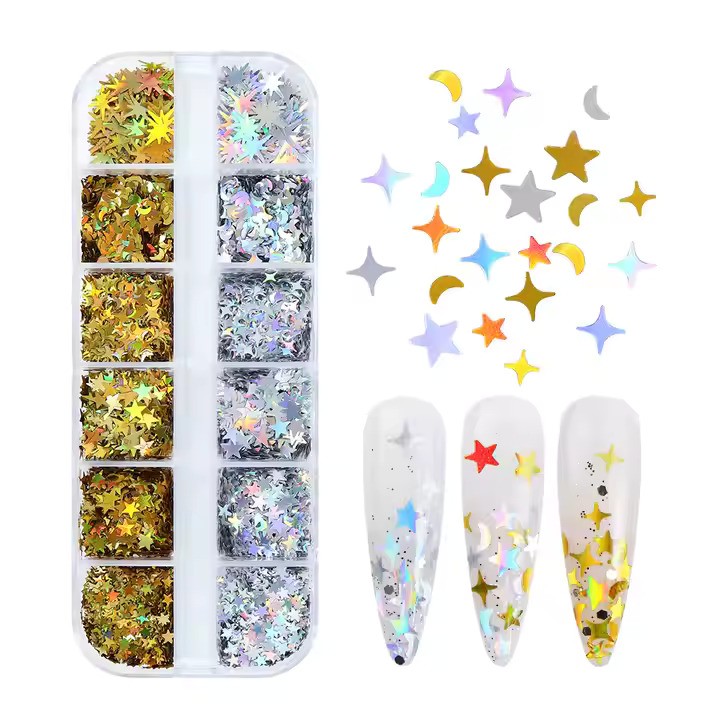 12li Holografik Gümüş ve Gold Ay Yıldız tırnak sanatı pulları, süsleme dekoru çeşitli renklerde pullar içerir: Tırnaklarınızı süslemek için size daha fazla seçenek sunan bir kutu tırnak pulu.