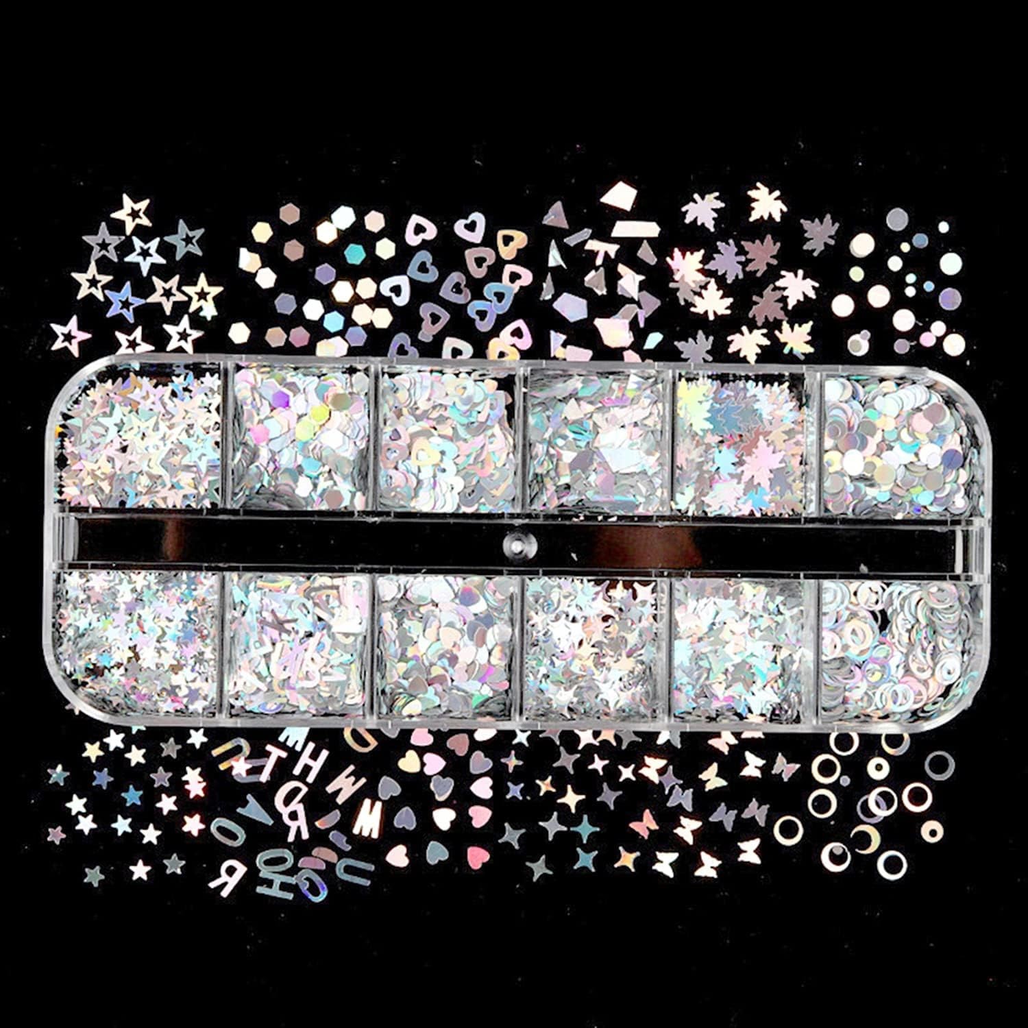 12li lazer gümüş holografik tırnak sanatı pulları, çeşitli şekillerde pullar içerir: aşk kalbi, harfler, kelebek, beş köşeli yıldızlar, daire, akçaağaç yaprakları vb. Tırnaklarınızı süslemek için size daha fazla seçenek sunan bir kutu tırnak simi pulu.