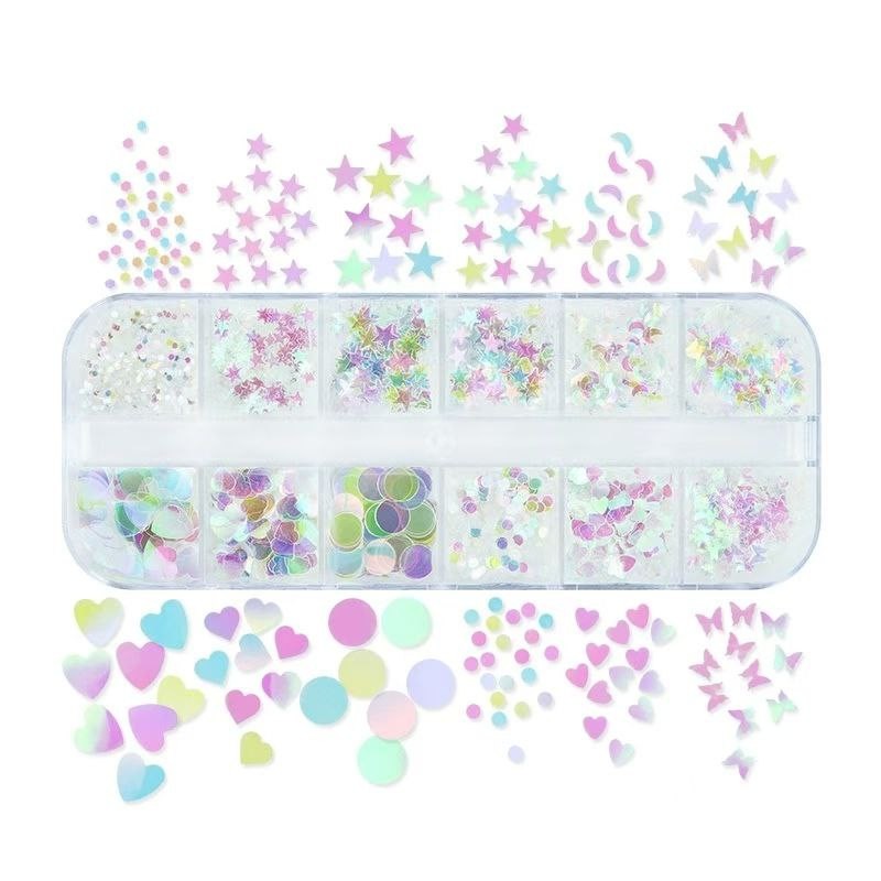 12li lazer Şeffa holografik tırnak sanatı pulları, çeşitli şekillerde pullar içerir: aşk kalbi, harfler, kelebek, beş köşeli yıldızlar, daire vb. Tırnaklarınızı süslemek için size daha fazla seçenek sunan bir kutu tırnak pulu.