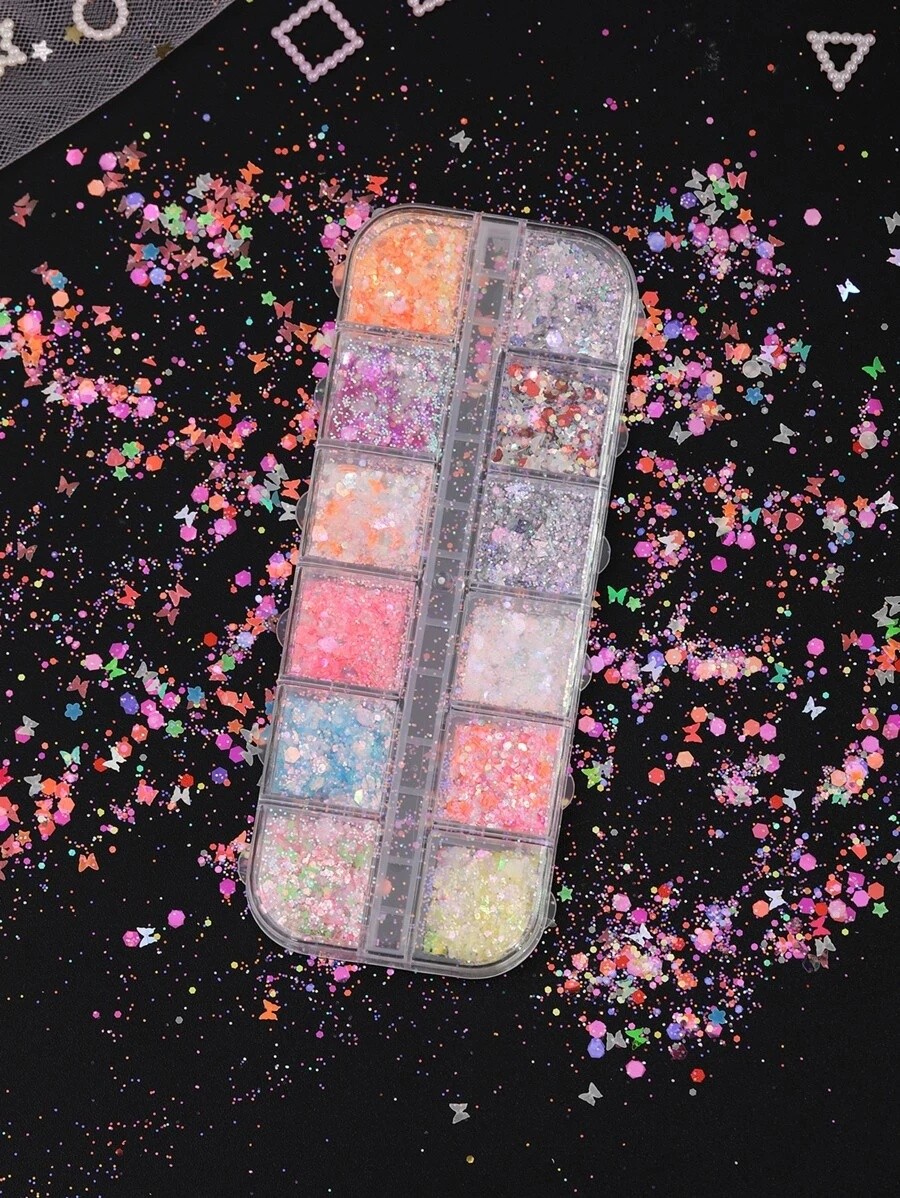 Renkli Tasarım - Karışık renkli Parlak neon, yıldız ve kelebek dizayn tırnak pullarından oluşan kutu, günlük kullanım ve seyahatte kullanım için uygundur.