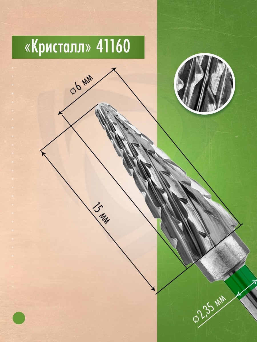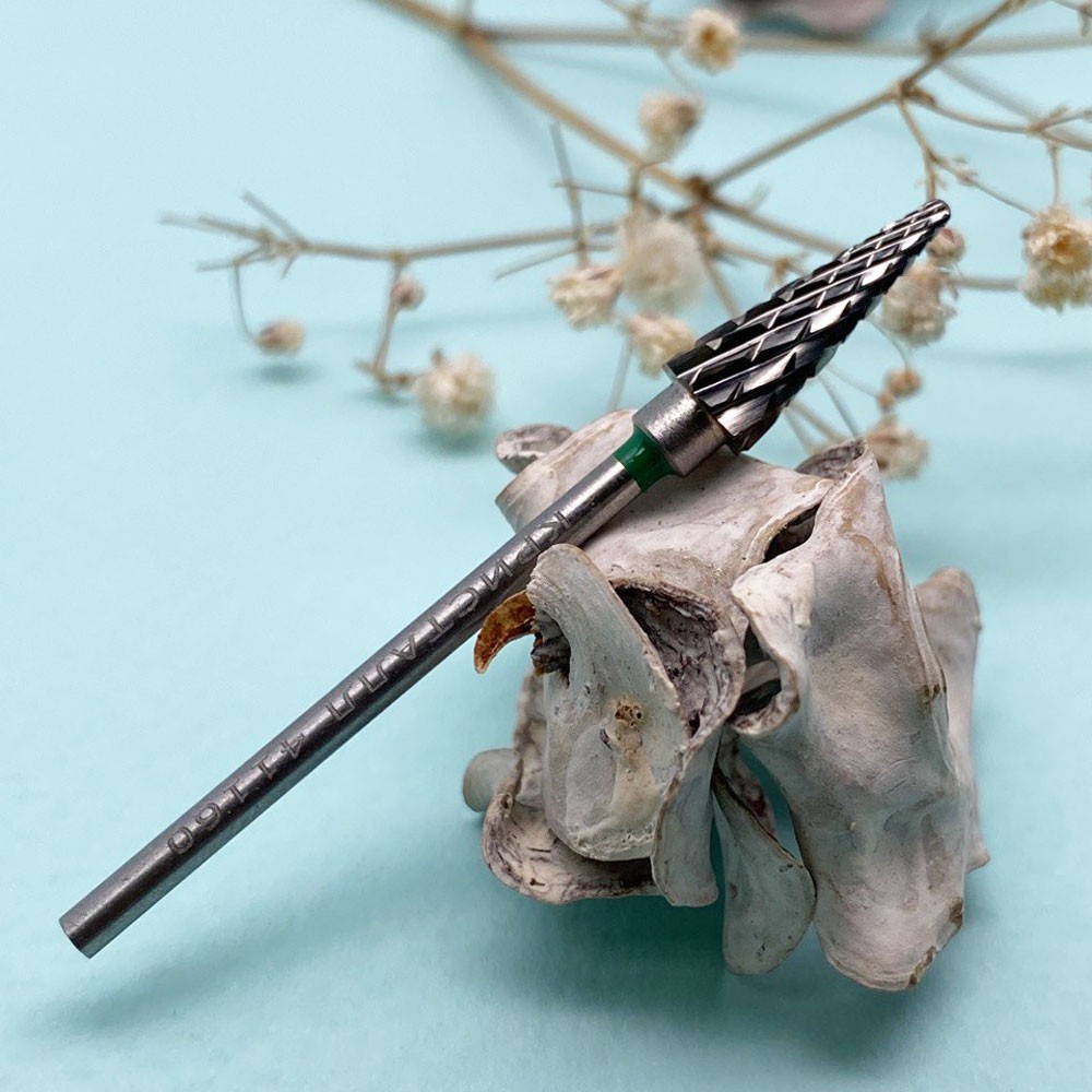 Profesyonel manikür ve pedikür uzmanları için geliştirilmiş Kristall 41160 freze ucu, konik formu ve yeşil şeritli kaba diş yapısıyla güçlü, hızlı ve kontrollü tırnak işlemleri sunar.
