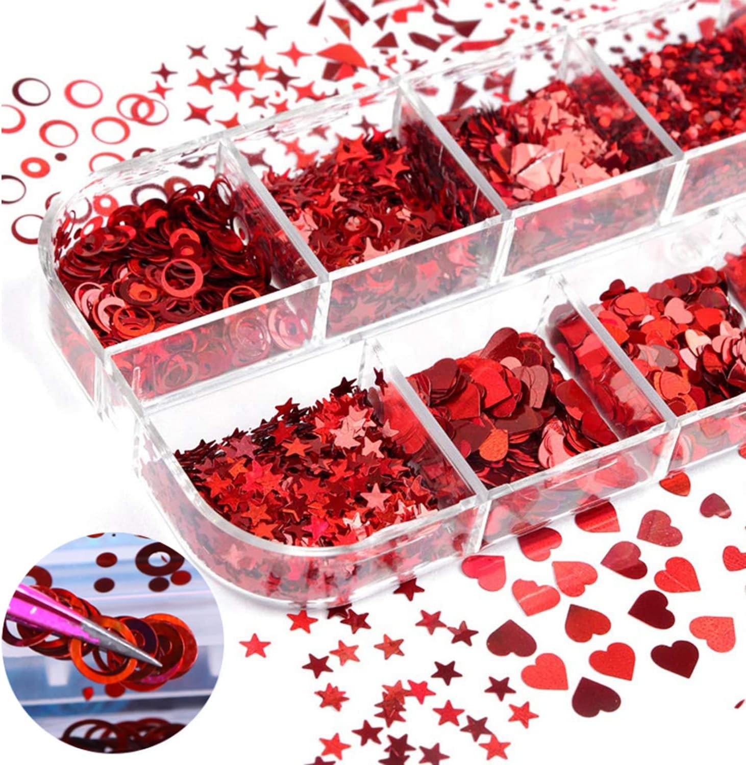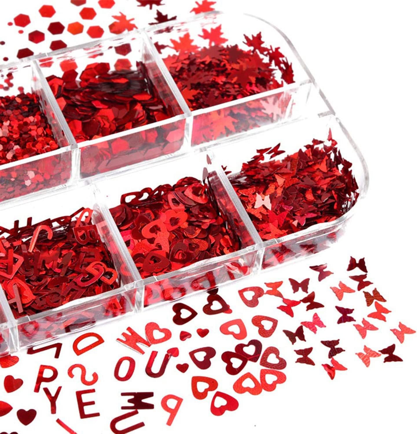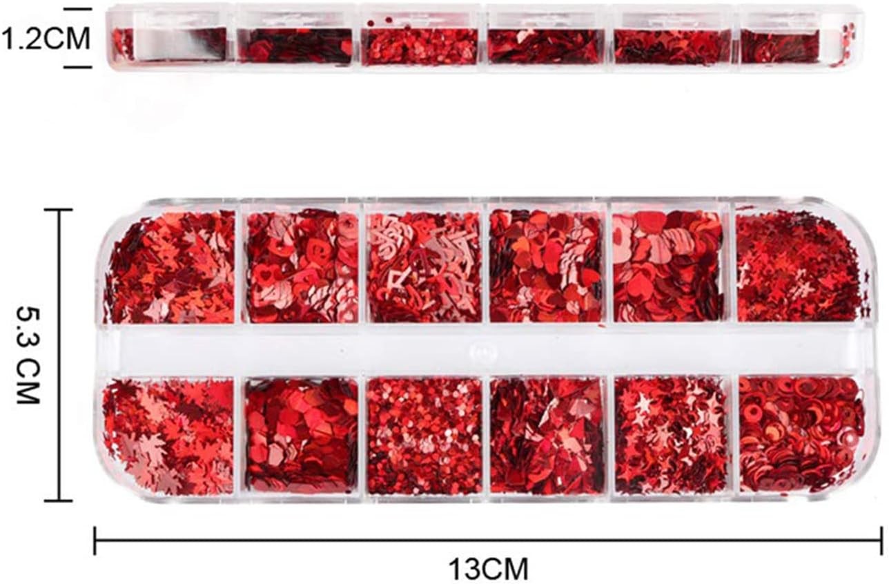 12li lazer Kırmızı parlak tırnak sanatı pulları, çeşitli şekillerde pullar içerir: aşk kalbi, harfler, kelebek, beş köşeli yıldızlar, daire, akçaağaç yaprakları vb. Tırnaklarınızı süslemek için size daha fazla seçenek sunan bir kutu tırnak pulu.