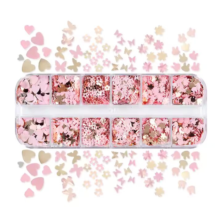12li Pembe ve Gold parlak tırnak sanatı pulları, çeşitli şekillerde pullar içerir: aşk kalbi, kelebek, yaprak, tavşan vb. Tırnaklarınızı süslemek için size daha fazla seçenek sunan bir kutu tırnak pulu.