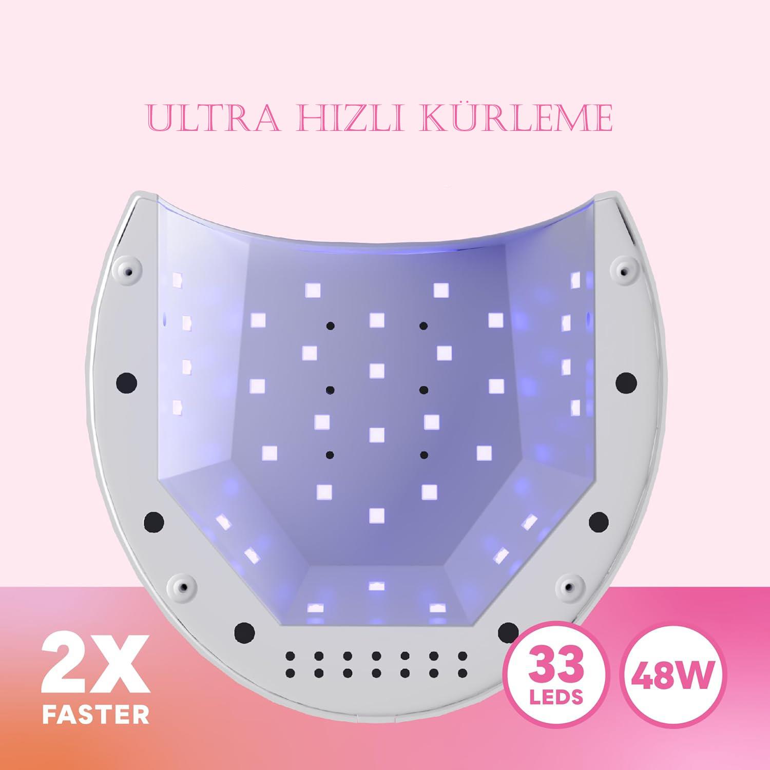 Ultra Hızlı Kürlenme Süresi Güçlü LED'ler ve tam kapsamlı tasarım sayesinde ultra hızlı kürlenme süreleriyle eşsiz hızı deneyimleyin. Uzun kuruma sürelerine veda edin ve diğer UV lambalarının yarısı kadar sürede mükemmel şekilde kürlenmiş tırnaklara merhaba deyin.